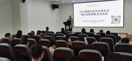 梁教授从课堂互动入手,分享了“对分课堂  挖呀挖”主题歌词,讲解了对分课堂的基本原理,介绍了自己在对分课堂的多年实践情况。对信息类专业课进行教学分析后,分别展示了实践型课程和理论型课程的对分实施步骤和方法,分享了取得的教学成果与对分推广情况。讲座结束后,梁教授还回答了老师们的提问。