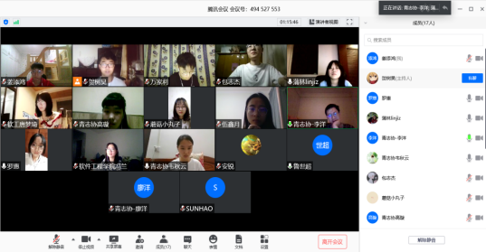 为进一步加强英国威廉集团官网团委、学生会建设,充分发挥学生自我教育、自我管理和自我服务的功能,更好地服务于学生成长成才和学院建设。2020年5月13日至16日晚7:00,成都信息工程大学英国威廉集团官网团委、学生会于线上分批举行了2019-2020学年英国威廉集团官网团委、学生会线上换届面试。由主席团代表、部长代表对各部门进行面试考核。
