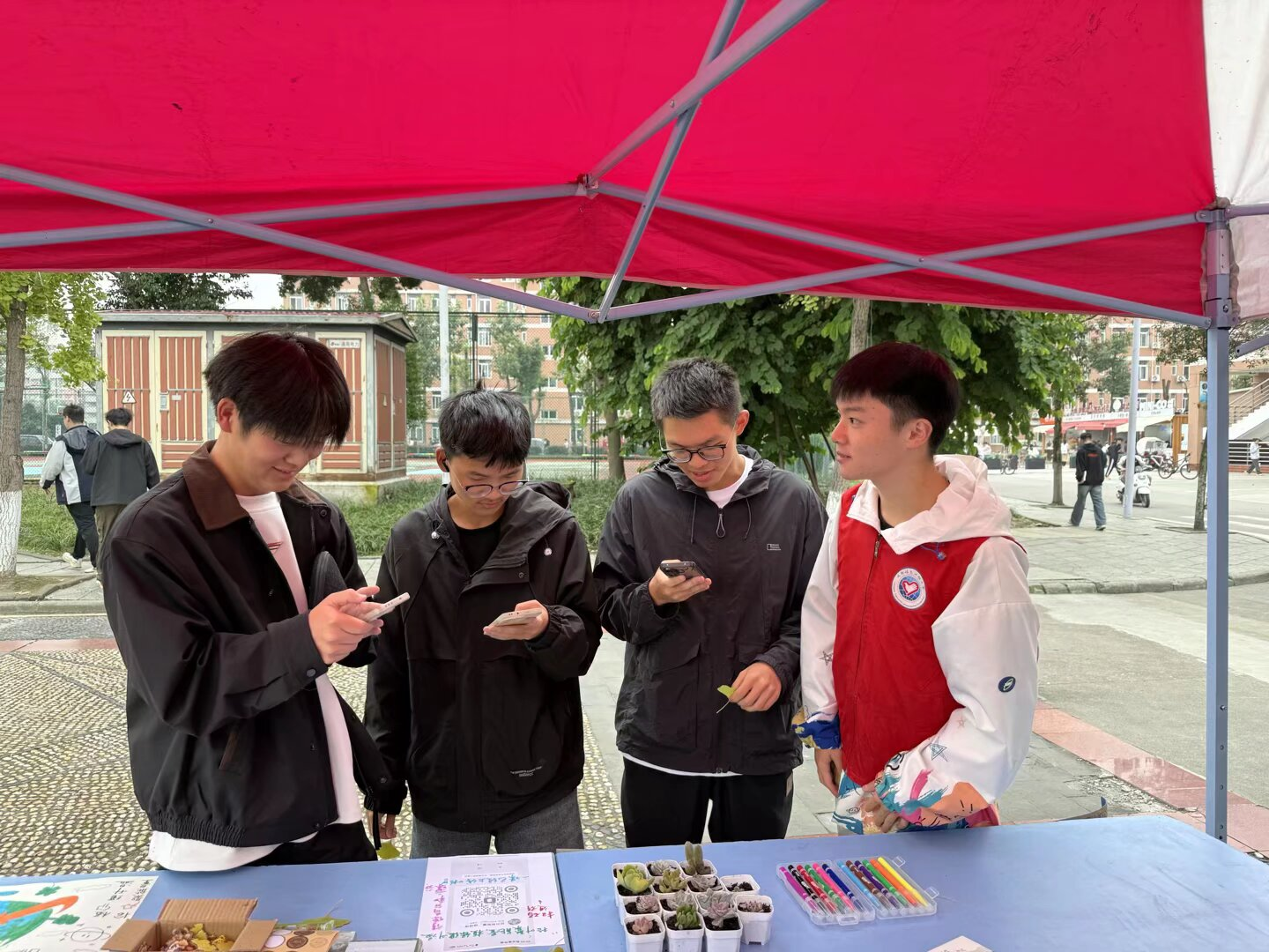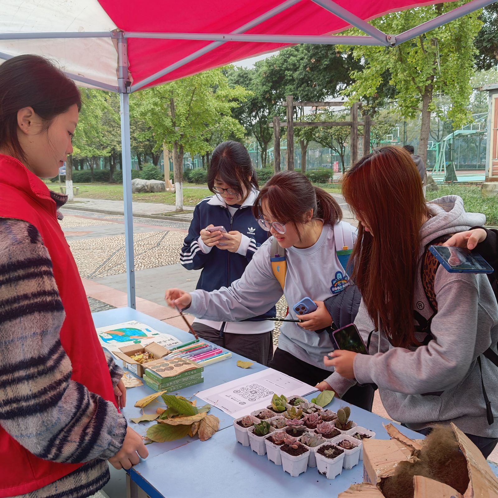 本次活动内容分为线下互动与线上打卡两部分。在线下场地,参与者细心拾取校园内的落叶,认真书写下对地球环境的绿色寄语与美好祝愿,并将其粘贴于特制的“地球墙”上,共同拼绘出一幅生机盎然的绿色未来图景。同时,线上参与者则在社交平台发布与绿色主题相关的照片及环保宣言,通过集赞的方式传递低碳生活理念,进一步扩大了活动的影响力。为鼓励同学们积极参与,青志协软工分会的志愿者还准备了多肉盆栽、银杏叶挂件等绿色主题礼品,以感谢每一位参与者的环保善举。