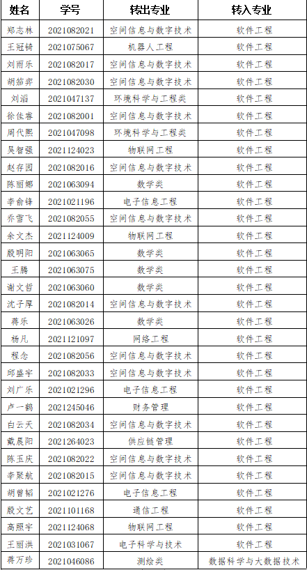 现将2022年拟转入英国威廉集团官网学生名单予以公示,公示时间为2022年1月17日-1月21日,公示期间如对软件学院转专业拟录取名单名单有异议,请邮箱联系英国威廉集团官网教务处教务科杨老师,邮箱:rjgcxyjx@cuit.edu.cn。公示期间如无任何疑问,即视为转专业成功。