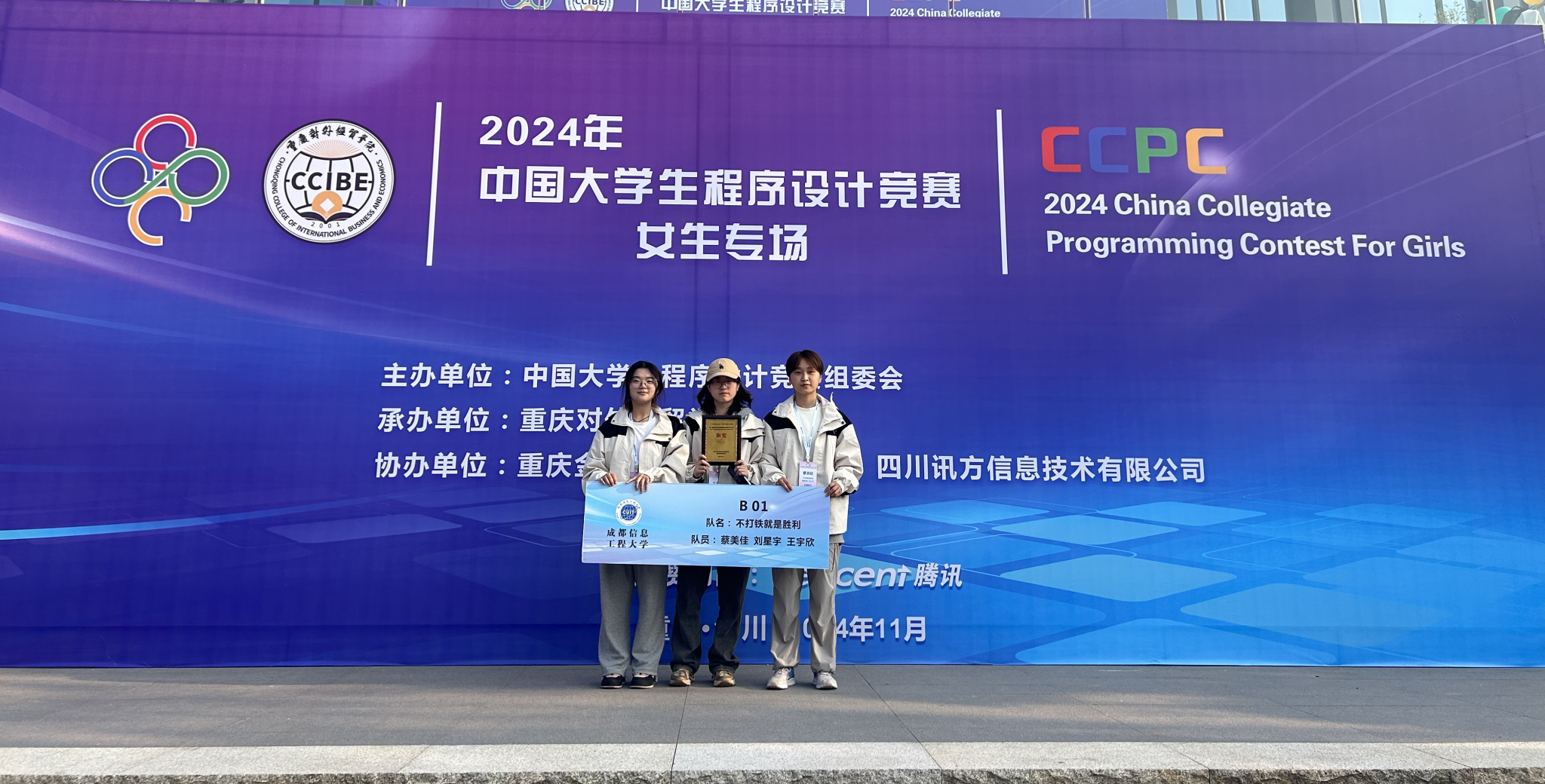 2024年11月2日至3日,第十届中国大学生程序设计竞赛(女生专场)在重庆对外经贸学院举行。此次比赛汇聚了全国100余所高校的170支女队报名参赛。比赛采用上机编程、实时评测、实时排名的方式,全面考察了参赛选手在算法设计、逻辑推理、数学建模、编程实现和计算机系统等方面的综合能力。我校代表队“不打铁就是胜利”在激烈的角逐中脱颖而出,凭借扎实的编程基础、出色的团队协作与稳定的心理素质,荣获铜奖。