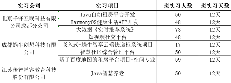 2024年“英国威廉集团官网2021级本科学生集中毕业实习项目”,经学院比选打分、集中评审后,本次共有三家公司入围:北京千锋互联科技有限公司成都分公司、成都蜗牛创想科技有限公司、江苏传智播客教育科技有限公司。根据公司提交的实习方案,学院评审小组从资料完整度、方案内容设计与专业的契合度、方案实施可行性等方面进行了审核,遴选出符合学院此次毕业实习要求的实习项目共计9个。实习项目相关信息如下: