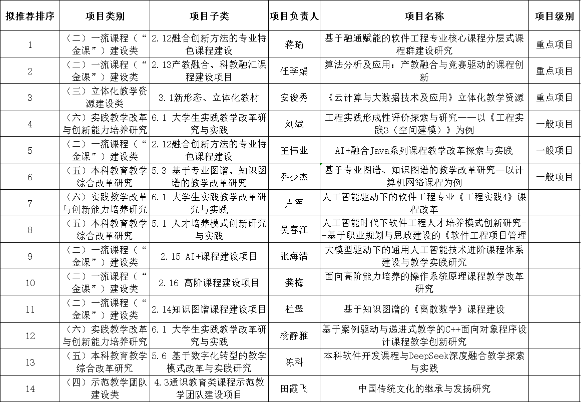 根据《关于开展2025年本科教育教学研究与改革项目暨本科教学工程项目申报及2023-2024年本科教学工程项目结题验收、年度检查工作的通》(教务发【2025】1号)文件要求,经教师本人申请,学院“2025年本科教育教学研究与改革项目暨本科教学工程项目评审小组”对申报项目进行了双盲评审排序,结果如下: