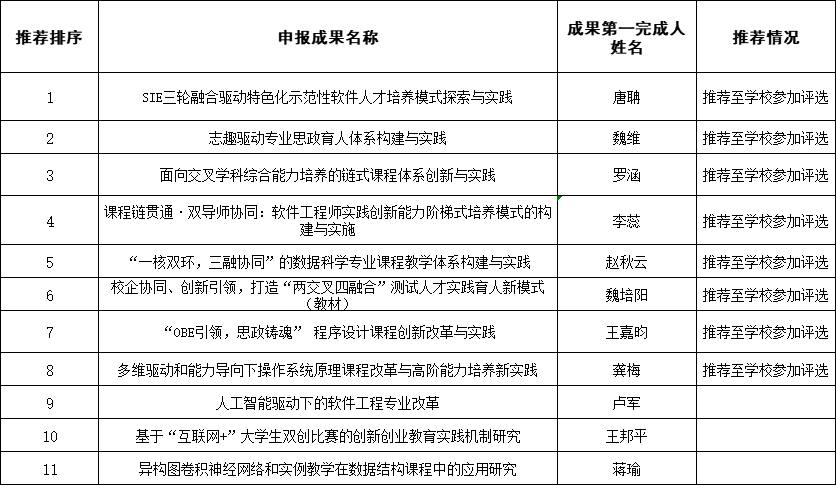 根据《关于开展2025年成都信息工程大学本科教育教学成果奖评选工作的通知(教务发[2024]27号)》文要求,经教师个人申报,学院组织外部专家开展双盲评审后,排序结果如下: